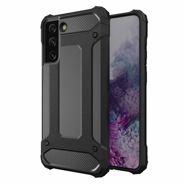 Kryt ze série Hybrid Armor je vyroben z termoplastického a odolného materiálu, který imituje pískovaný kov a uhlík. Dokonale chrání telefon před poškozením pádem nebo poškrábáním. Zvýšené okraje kolem displeje a zadního fotoaparátu chrání telefon před poškrábáním těchto prvků, když je položen na rovný povrch. Má jemná tlačítka s citlivou odezvou a výřezy pro porty.