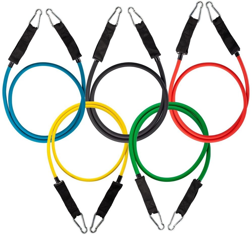 Sada pěti tréninkových odporových gum vyrobených z přírodního kaučuku. Umožňují vám provádět fyzická cvičení bez omezení doma. Spolu s gumami v sadě najdete: